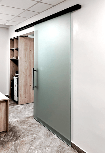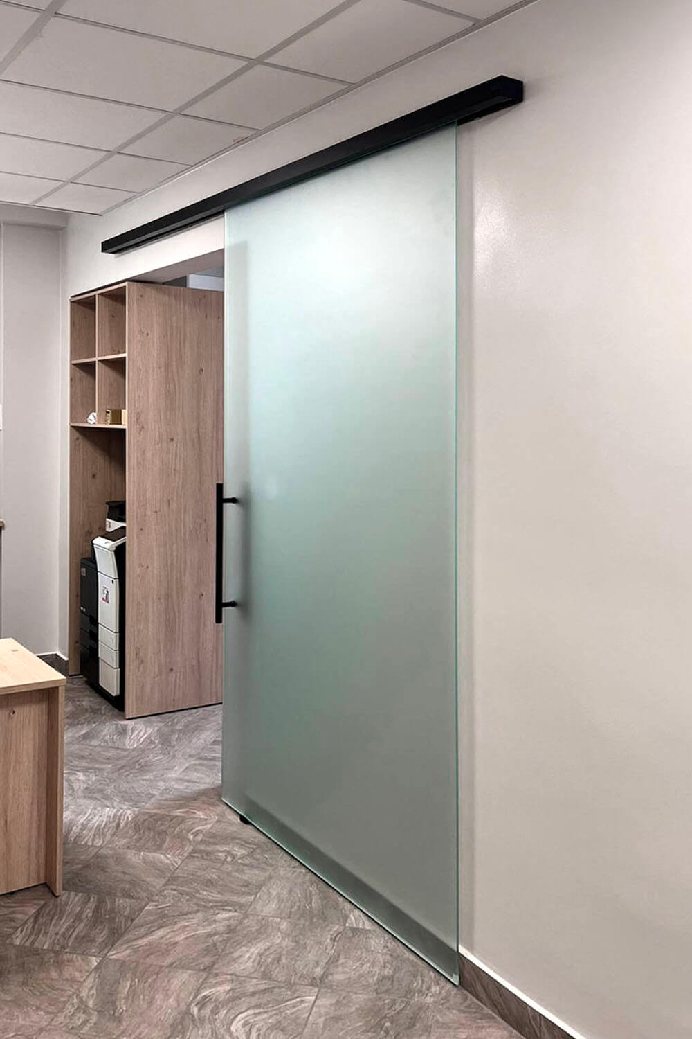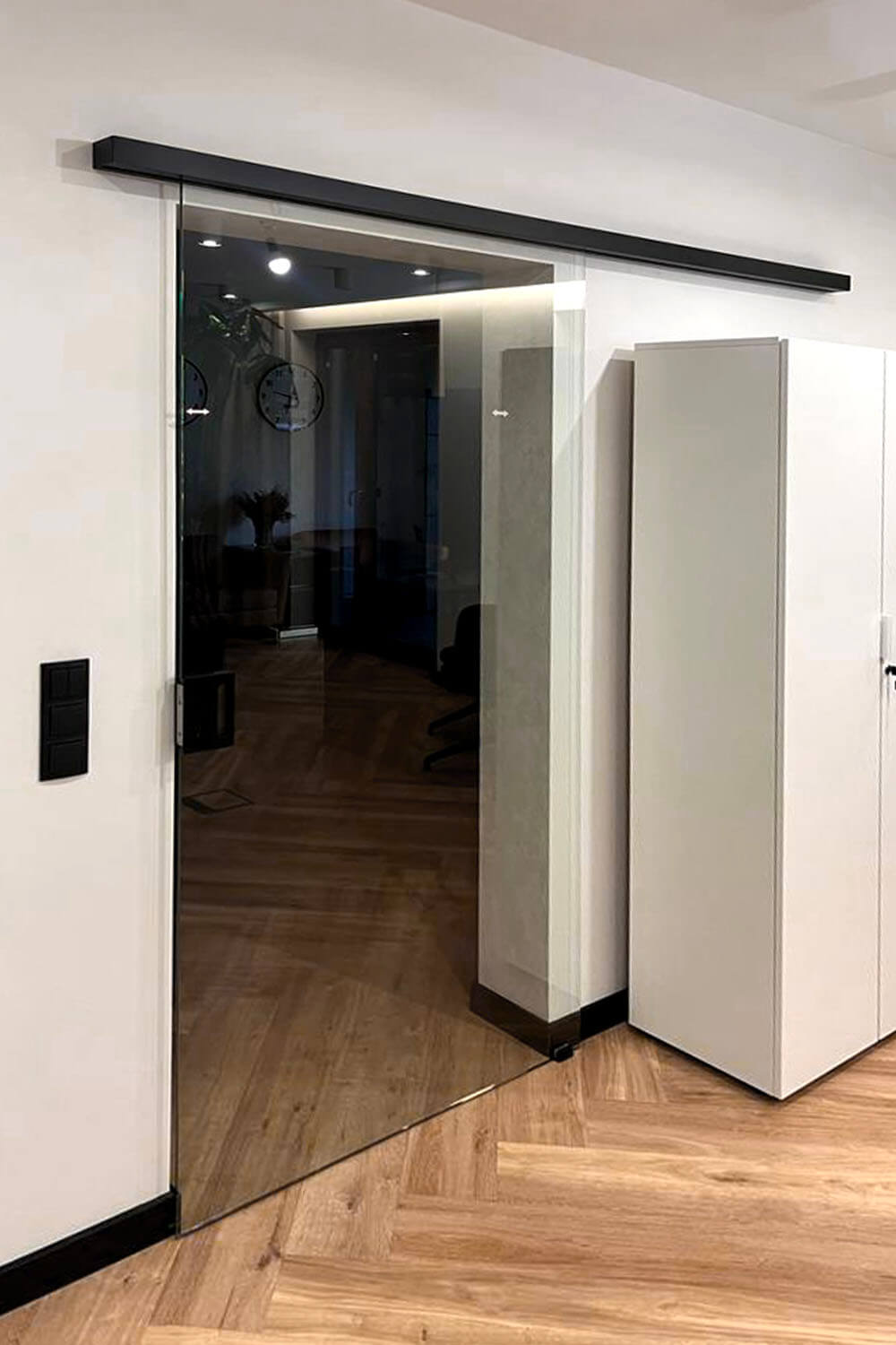 - Drzwi szklane przesuwne – idealne do małych mieszkań i nowoczesnych biur, gdzie liczy się każda oszczędność miejsca.